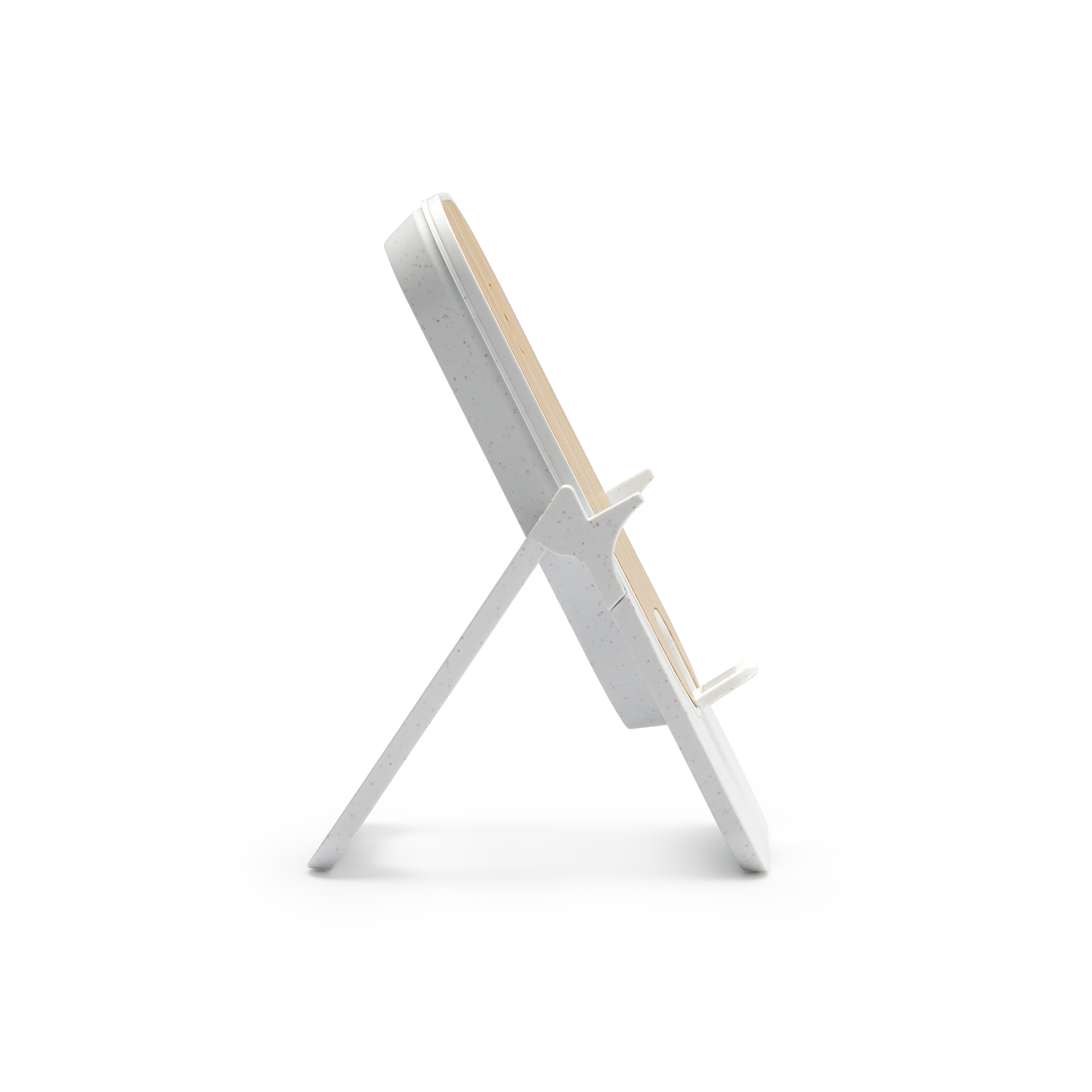 Cargador inalámbrico plegable, con cuerpo elaborado en fibra de trigo y superficie de carga en bambú.