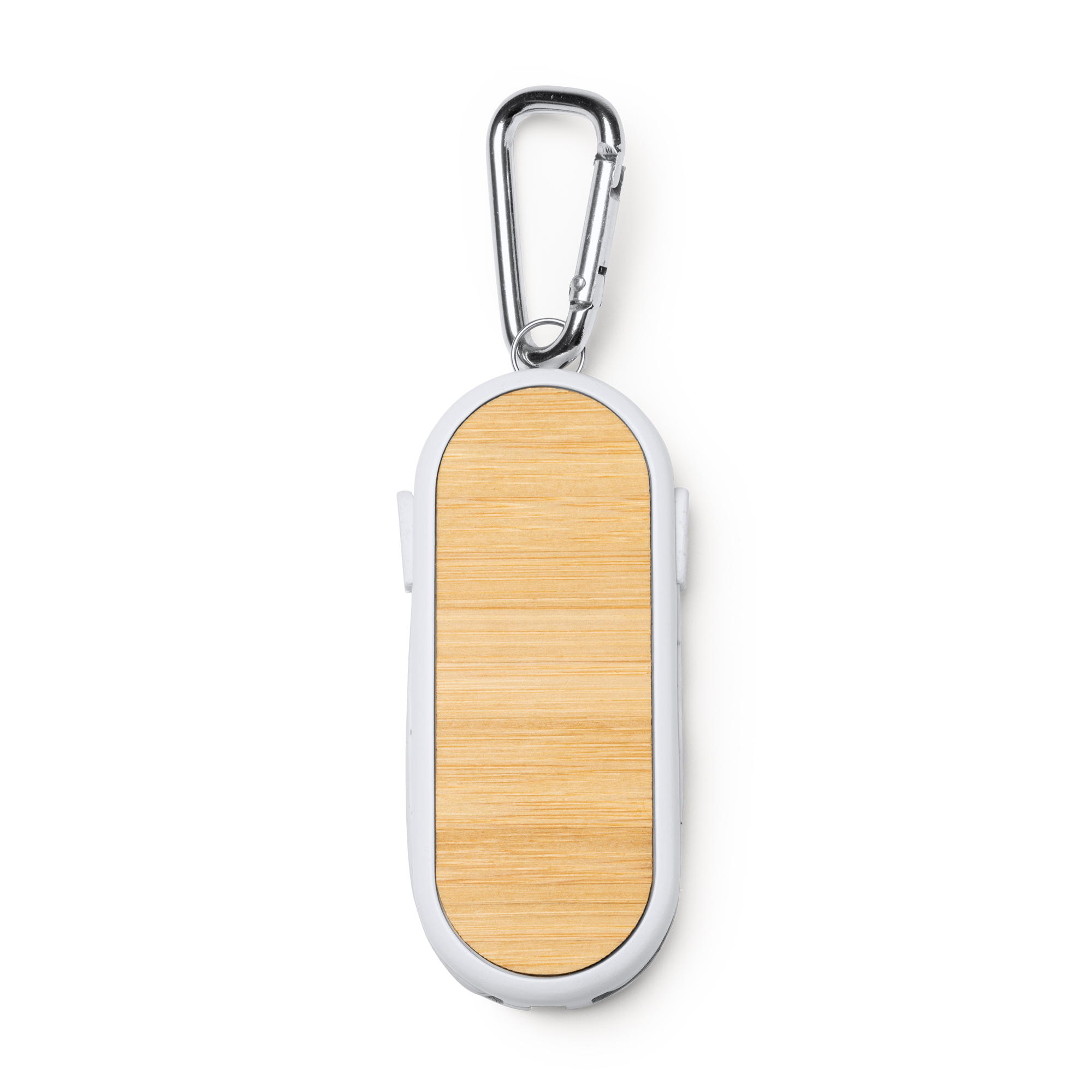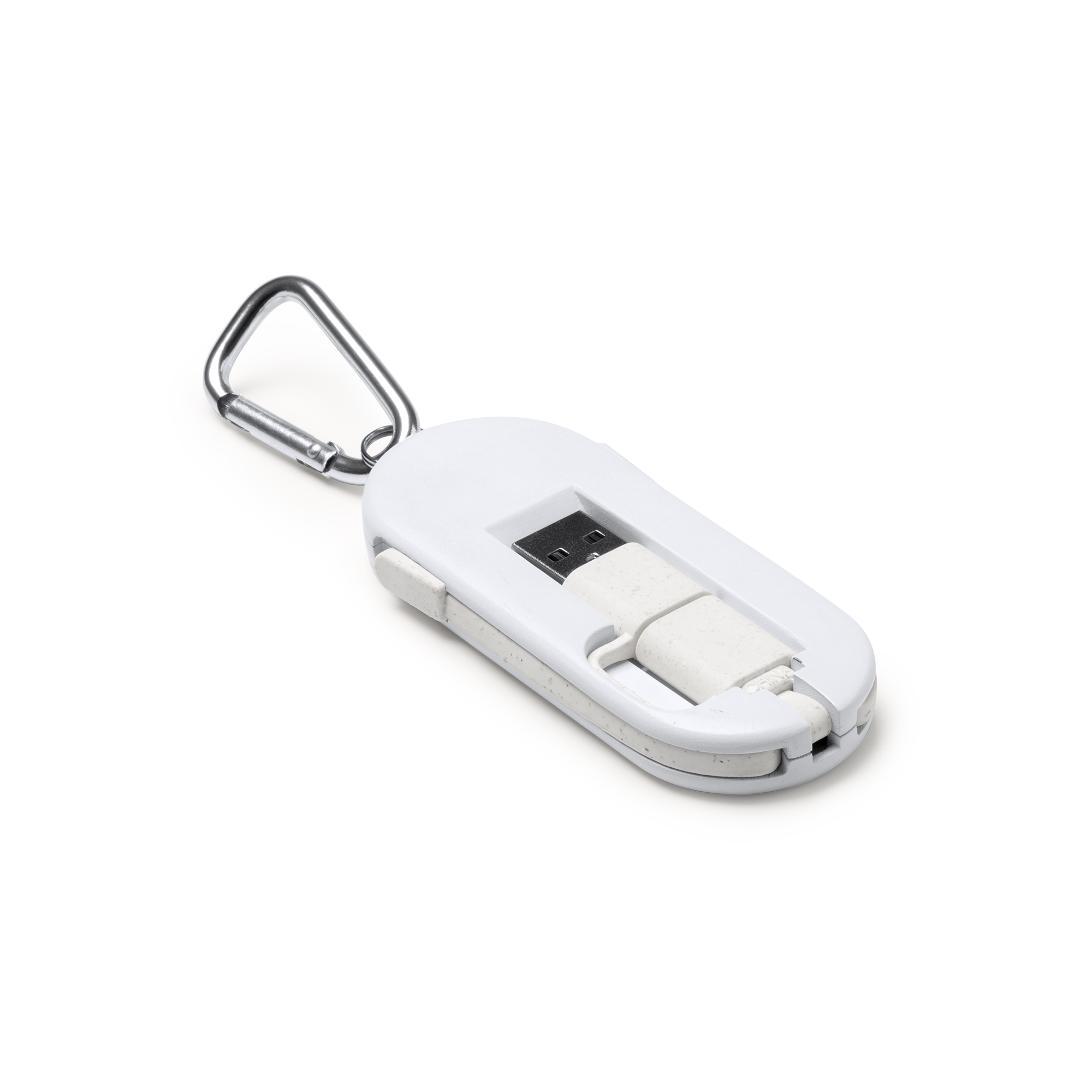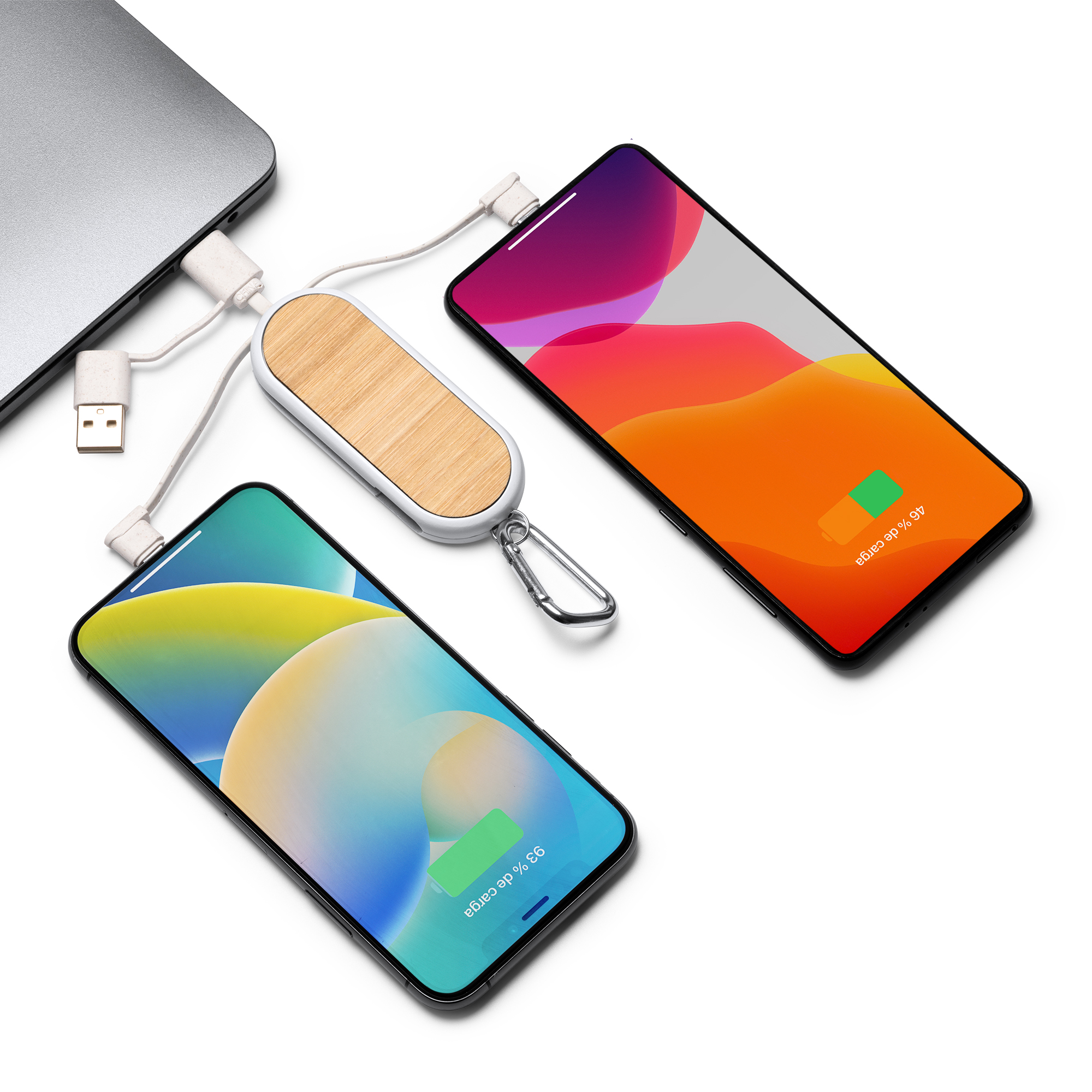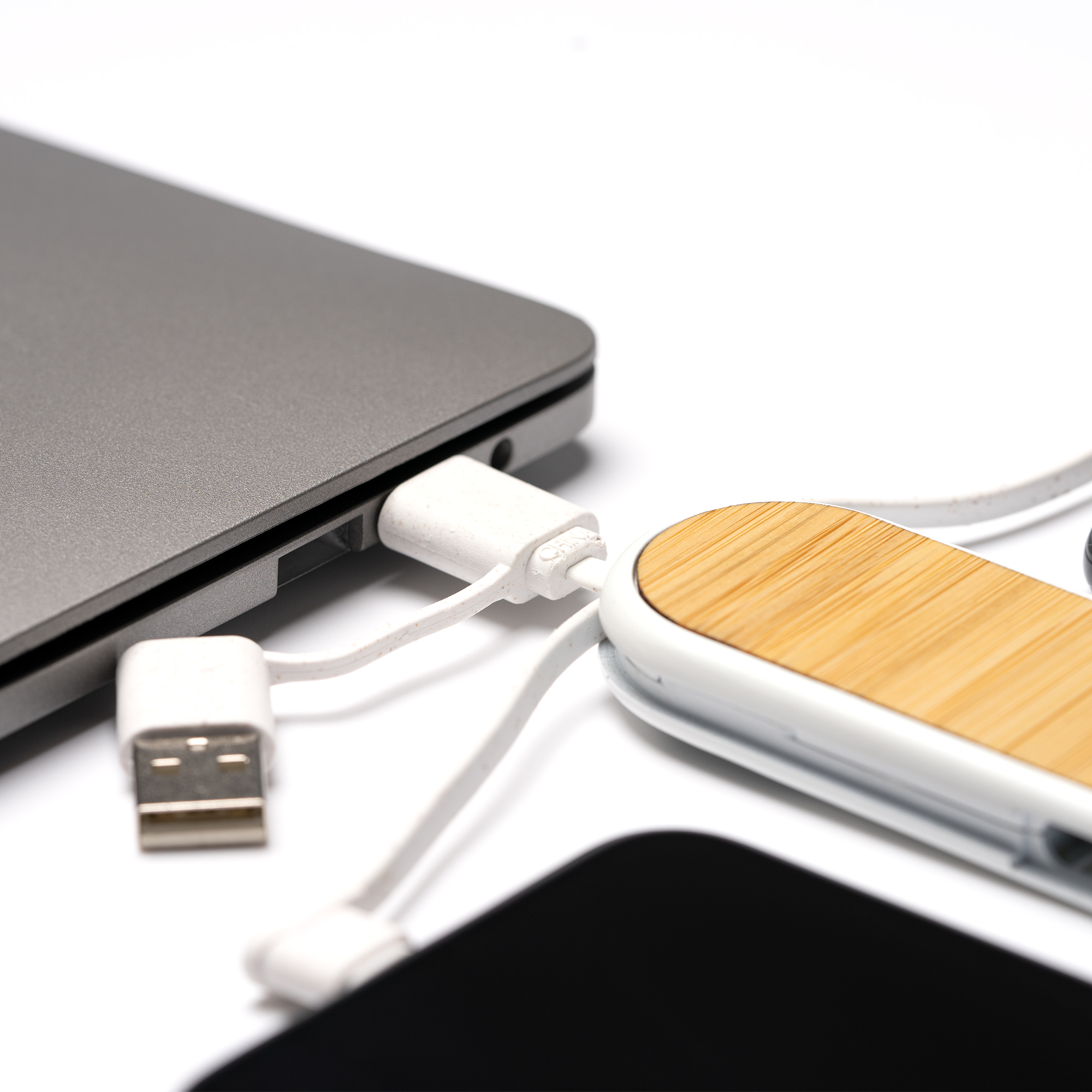 Cable cargador 4 en 1, con cuerpo fabricado en fibra de trigo y superficie en bambú. Cables también en fibra de trigo.
