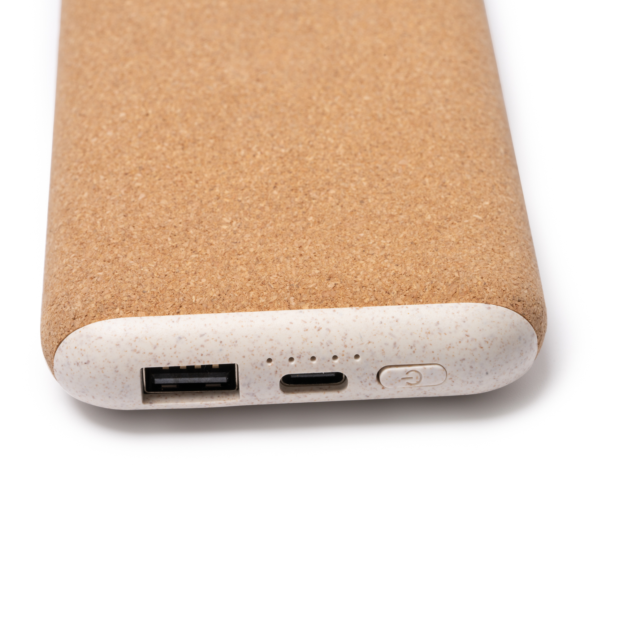 Batería externa con cuerpo de corcho y fibra de trigo. Capacidad 10.000 mAh.